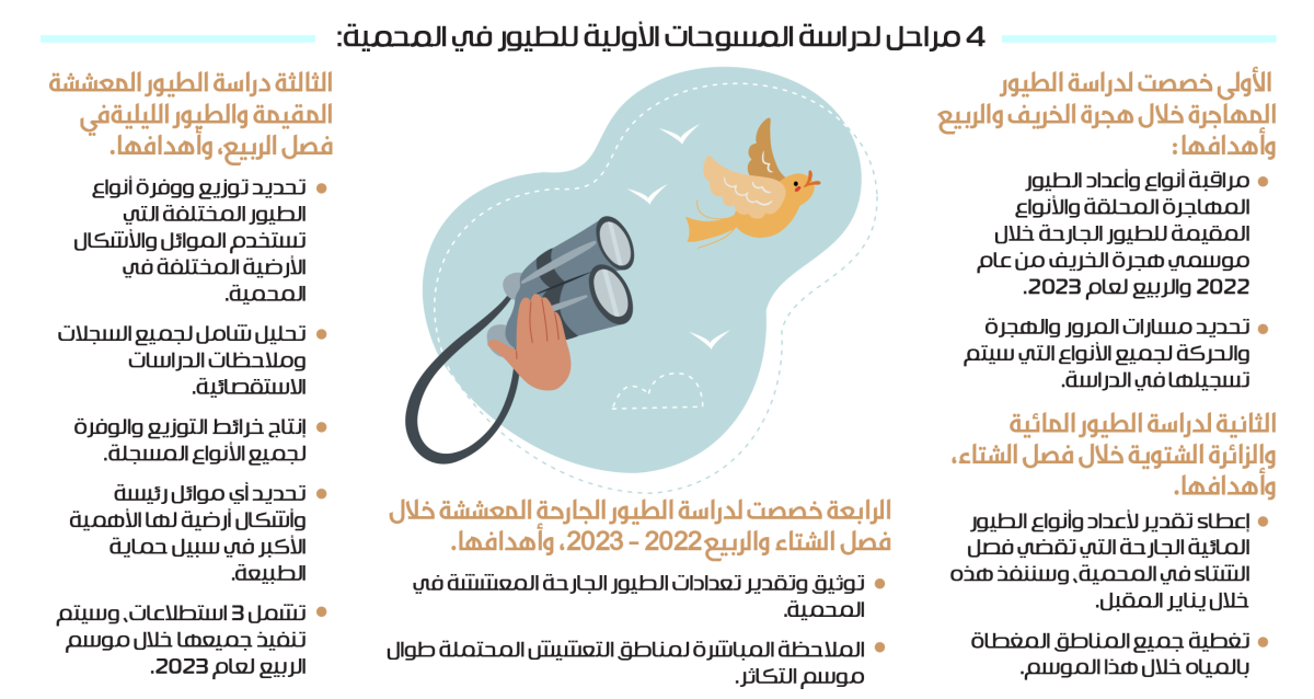 وسيتم تنفيذ دراسة المسوحات الأولية للطيور في المحمية من خلال أربع مراحل رئيسة: المرحلة الأولى خصصت لدراسة الطيور المهاجرة خلال هجرة الخريف والربيع.
