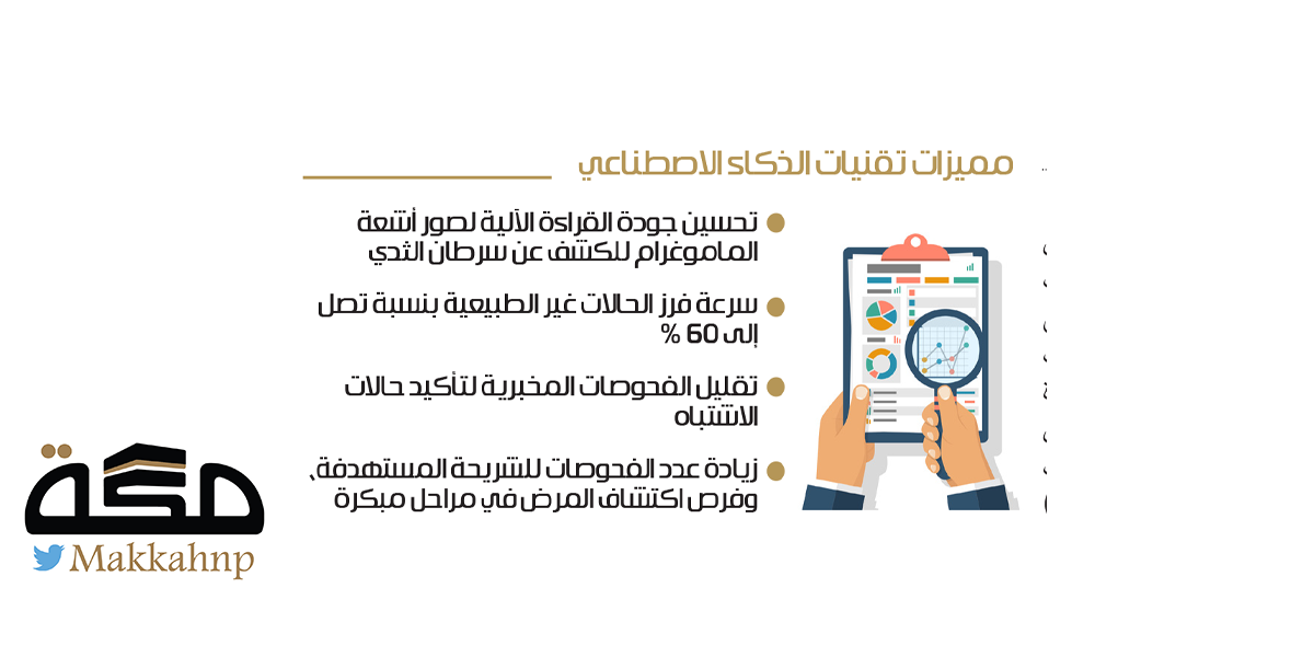 قلص الذكاء الاصطناعي نسبة الخطأ في تشخيص سرطان الثدي، وذلك حسب الهيئة السعودية للبيانات والذكاء الاصطناعي، فبعد أن كانت نسبة الخطأ تصل إلى 20 % بالطرق التقليدية تقلصت إلى 3 % عبر تقنيات الذكاء الاصطناعي.