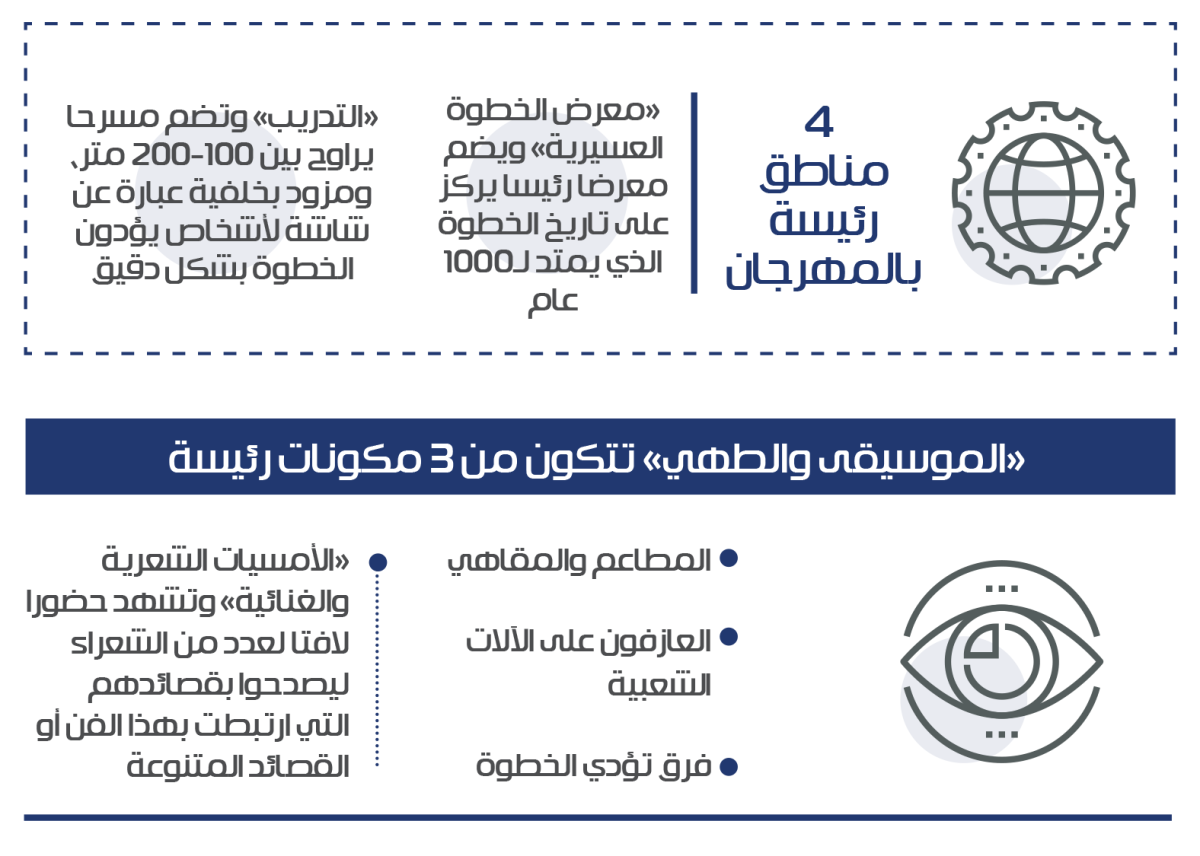 ويتضمن المهرجان 4 مناطق رئيسة، تبدأ مع «أوبريت الافتتاح» مع إيقاع الخطوة الجنوبية، ويرتبط الغناء بأبيات شعرية وطنية مرتبطة بشعر الخطوة، حيث بدأ هذا الفن كرقصة حرب وتطور عبر الأجيال ليصل لما هو عليه الآن، ويحتوي على 20 لحنا مختلفا، وتتنوع الخطوة بناء على ألحانها وهدوء هذه الألحان بين بلقرن وتهامة ومحايل عسير ورجال ألمع ورجال الحجر والمسقي ببلاد شهران والواديين ببلاد قحطان، وصولا إلى سراة عسير؛ ليسلط المعرض الضوء على هذه الاختلافات عبر شاشات العرض الطولية.