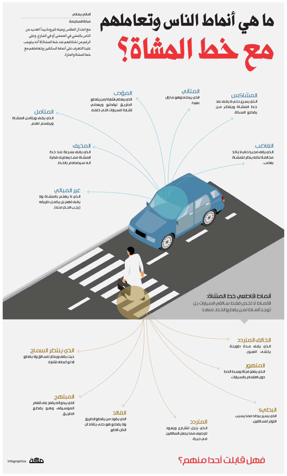 وعلى الرغم من اختلافهم عند خط المشاة إلا أنه يتوجب علينا التعرف على أنماط السائقين وتعاملهم مع خط المشاة والمارة .