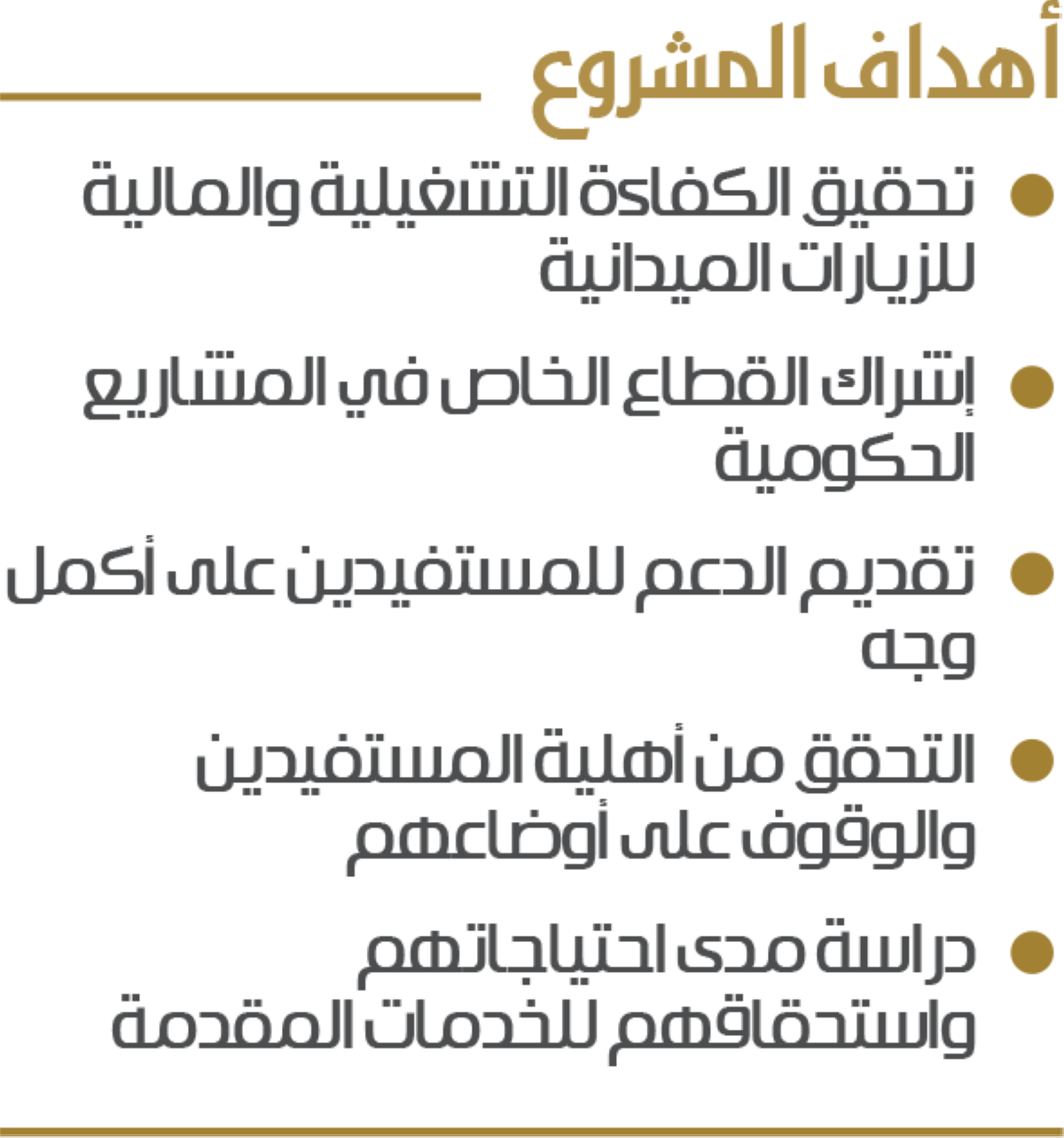 يهدف المشروع إلى تحقيق الكفاءة التشغيلية والمالية للزيارات الميدانية للمستفيدين من نظام الضمان الاجتماعي، وإشراك القطاع الخاص في المشاريع الحكومية، وتحقيق استراتيجية الوزارة بتفعيل دور القطاع الخاص بالانتقال إلى الدور التشريعي والرقابي، وتشغيل خدمات الوزارة، وتقديم الدعم للمستفيدين على أكمل وجه.