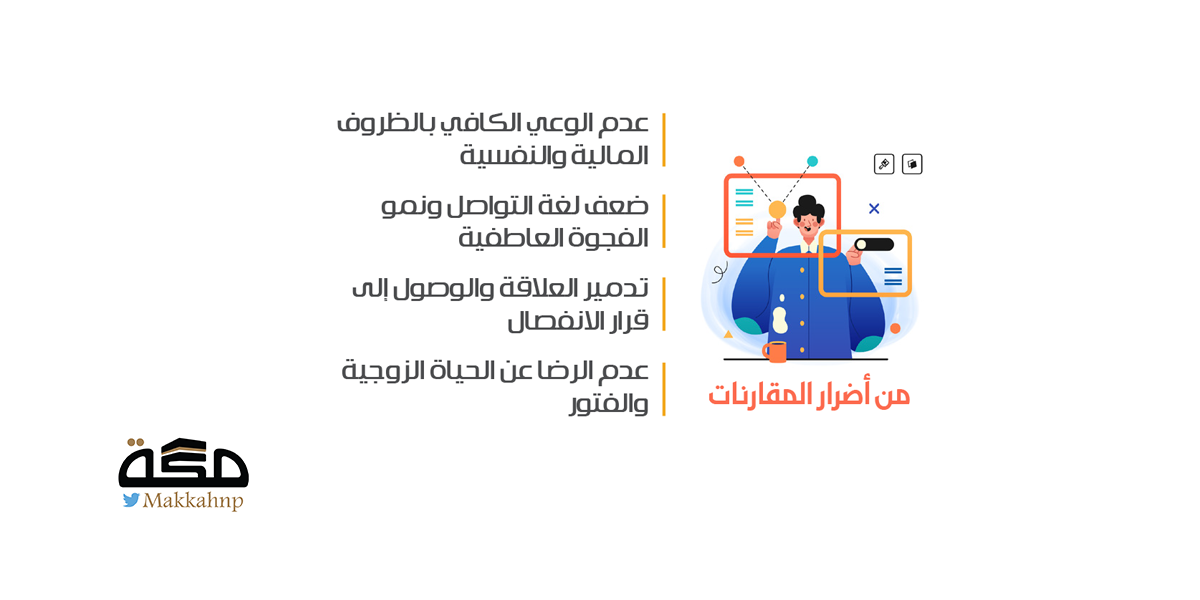 وأبرز المجلس عددا من أضرار المقارنات مع الآخرين، منها اضطراب العلاقات وفتور المشاعر، وإثارة مشاعر الغيرة والحسد والصفات غير الحميدة، والتركيز على السلبيات وتجاهل الإيجابيات في الطرفين، إلى جانب التصرف بعناد ومكابرة وعدم تقبل الآخر.