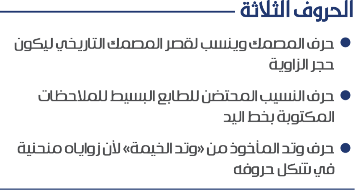 وجاء «حرف المصمك» كأول هذه الخطوط لينسب إلى قصر المصمك التاريخي؛ ليكون حجر الزاوية لحروف المحترف السعودي التي تلته، ويتميز بكونه متينا ثابت البنيان واضح الملامح سهل القراءة، ويمتاز عن بقية الحروف لأن رسومه الأولى وضعت دون الرجوع إلى أساليب الخط التقليدية، وأما الثاني فهو «حرف النسيب» المحتضن للطابع البسيط للملاحظات المكتوبة بخط اليد، بحيث تظهر على حروفه حركة اليد في الكتابة، ويصلح استخدامه في العناوين والنصوص المرسلة، إضافة إلى مناسبته للمناسبات الأدبية والشعر وقصص الأطفال، والثالث «حرف وتد» المأخوذ من «وتد الخيمة» لأن زواياه منحنية في شكل حروفه تذكر بشكل وتد زوايا الخيام، ويتصف هذا الحرف بديناميكية الحركة؛ لذلك يتناسب مع نصوص المهرجانات والمناسبات الرياضية.