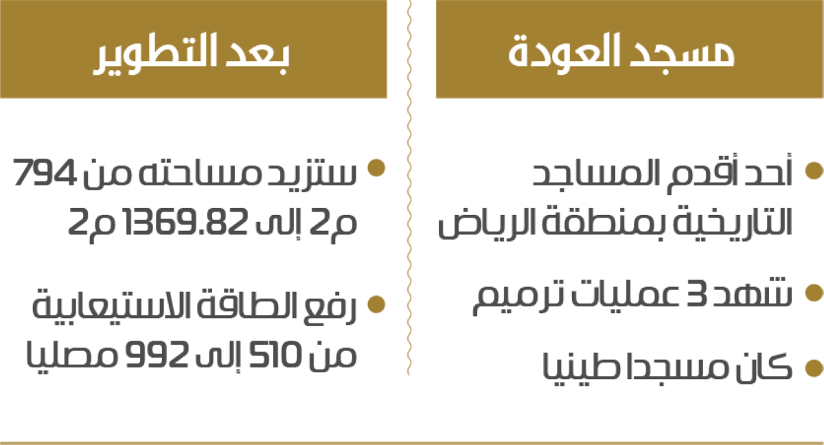 بهدف إعادته إلى سابق عهده من حيث الشكل والمضمون، دخل مسجد العودة، أحد أقدم المساجد التاريخية بمنطقة الرياض، ضمن المرحلة الثانية لمشروع الأمير محمد بن سلمان لتطوير المساجد التاريخية.