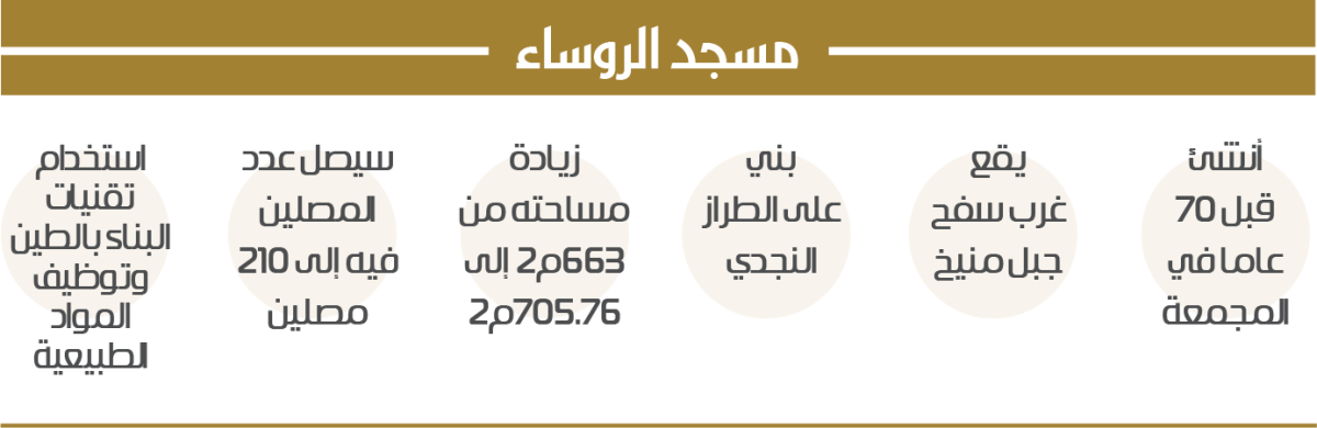 يواصل مشروع الأمير محمد بن سلمان لتطوير المساجد التاريخية دوره في العناية بالمساجد التاريخية، واستعادة الدور الديني والثقافي والاجتماعي لها، والمحافظة على إرثها الإسلامي، إذ ضمت مرحلته الثانية مسجد الروساء في محافظة المجمعة ضمن أعمالها، لتجديده بعد نحو 70 عاما من بنائه.