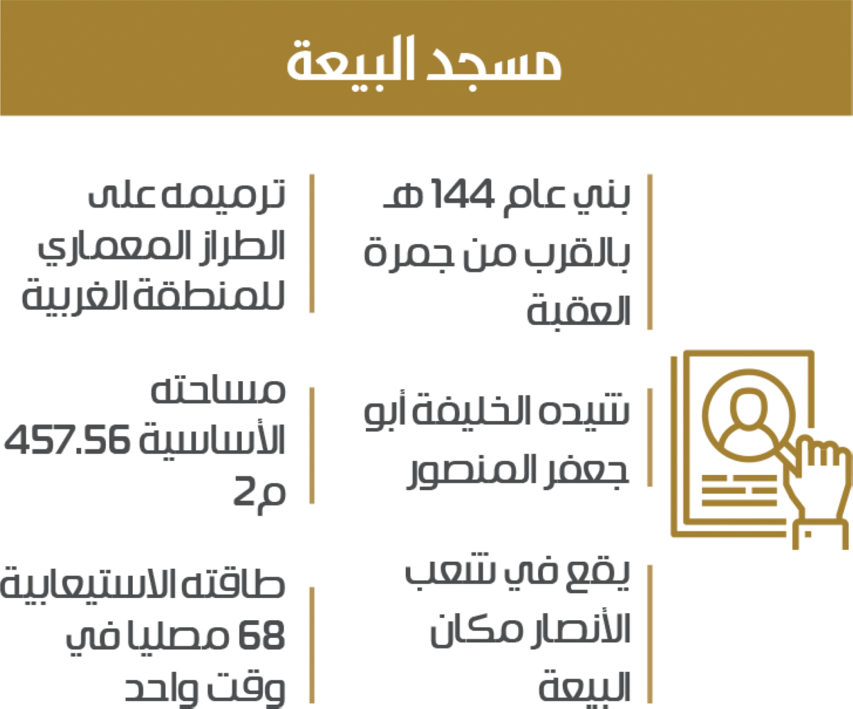 ويمثل مسجد البيعة الذي بني في 144هـ بالقرب من جمرة العقبة بمشعر منى أحد المساجد المستهدفة بالتطوير لما يمثله من أهمية تبرز في سيرته الذاتية، حيث يتميز المسجد الواقع في «شعب الأنصار» مكان البيعة التي نتجت عنها هجرة النبي صلى الله عليه وسلم في مشعر منى، بخصائص معمارية فريدة، تعتمد على مجموعة من القيم الفنية والسياقية في مجال العمارة والبناء.