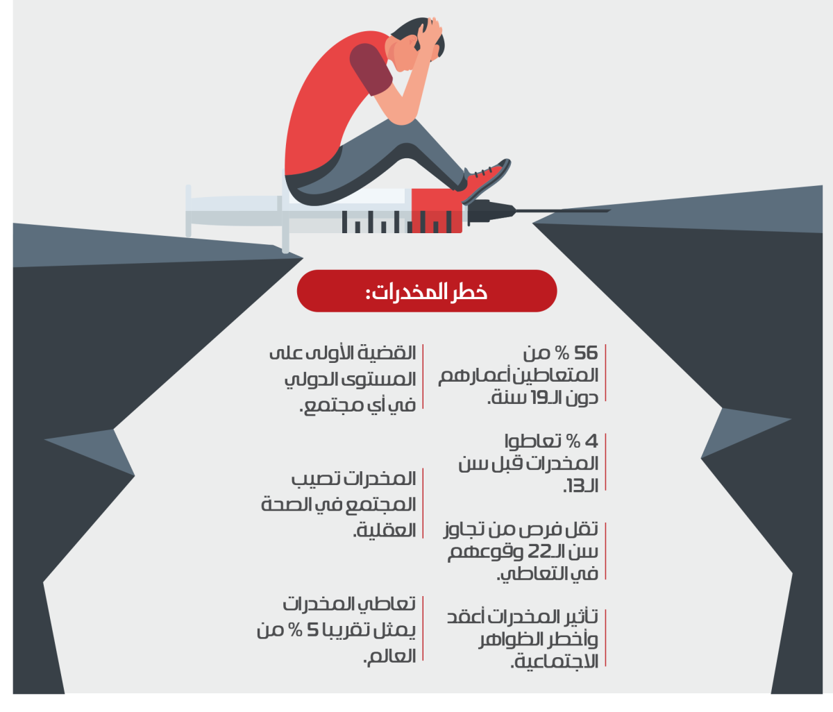 وتطرق الحوار لخطر تعاطي المخدرات والمؤثرات العقلية التي تستهدف فئة الشباب الصغار، وبحسب الأبحاث فإن 56 % من المتعاطين أعمارهم دون 19 سنة، 4 % تعاطوا المخدرات قبل سن الثالثة عشرة، فيما تقل فرص من تجاوز سن 22 وقوعهم في تعاطي المخدرات وهذا مرتبط بالنمو والقدرة على صناعة القرارات، وأن تأثير المخدرات أعقد وأخطر الظواهر الاجتماعية التي تعصف بالمجتمعات حول العالم في الوقت المعاصر.
