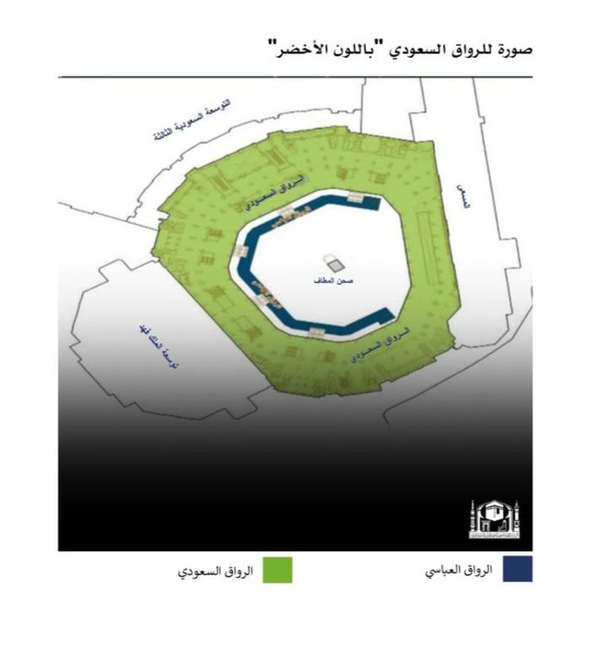 وأفاد بأن الرواق السعودي يحيط بالرواق العباسي ليكون مكملا له، مع تميزه بمساحة أوسع لم يشهدها المسجد الحرام من قبل، حيث يتكون من 4 أدوار وهي: الدور الأرضي، والدور الأول والدور الثاني «الميزانان»، والسطح وأصبحت الطاقة الاستيعابية للرواق السعودي 287.000 مصل، و107.000 طائف في الساعة بالرواق وصحن المطاف.