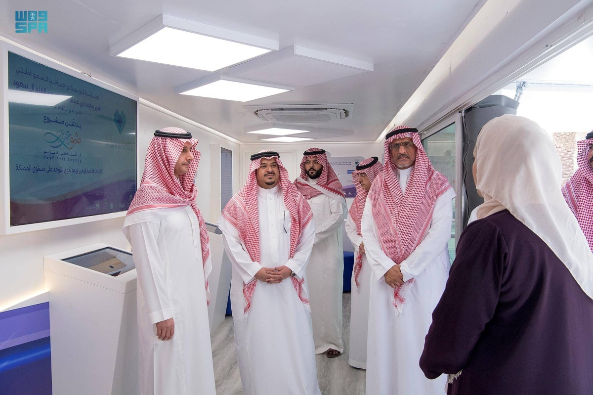 لتجوب 53 مدينة ومحافظة وقرية دعما لهذه الفئة الغالية، دشن نائب أمير منطقة الرياض محمد بن عبدالرحمن بقصر الحكم أمس، قافلة «طيف عزيز»، أحد مشاريع جمعية أسر التوحد بالشراكة مع «مركز طيف عزيز» للاضطرابات النمائية والسلوكية واضطراب طيف التوحد. واطلع خلال جولته داخل القافلة على الخدمات والتجهيزات الالكترونية، يرافقه رئيس مجلس إدارة جمعية أسر التوحد الأمير سعود بن فرحان.