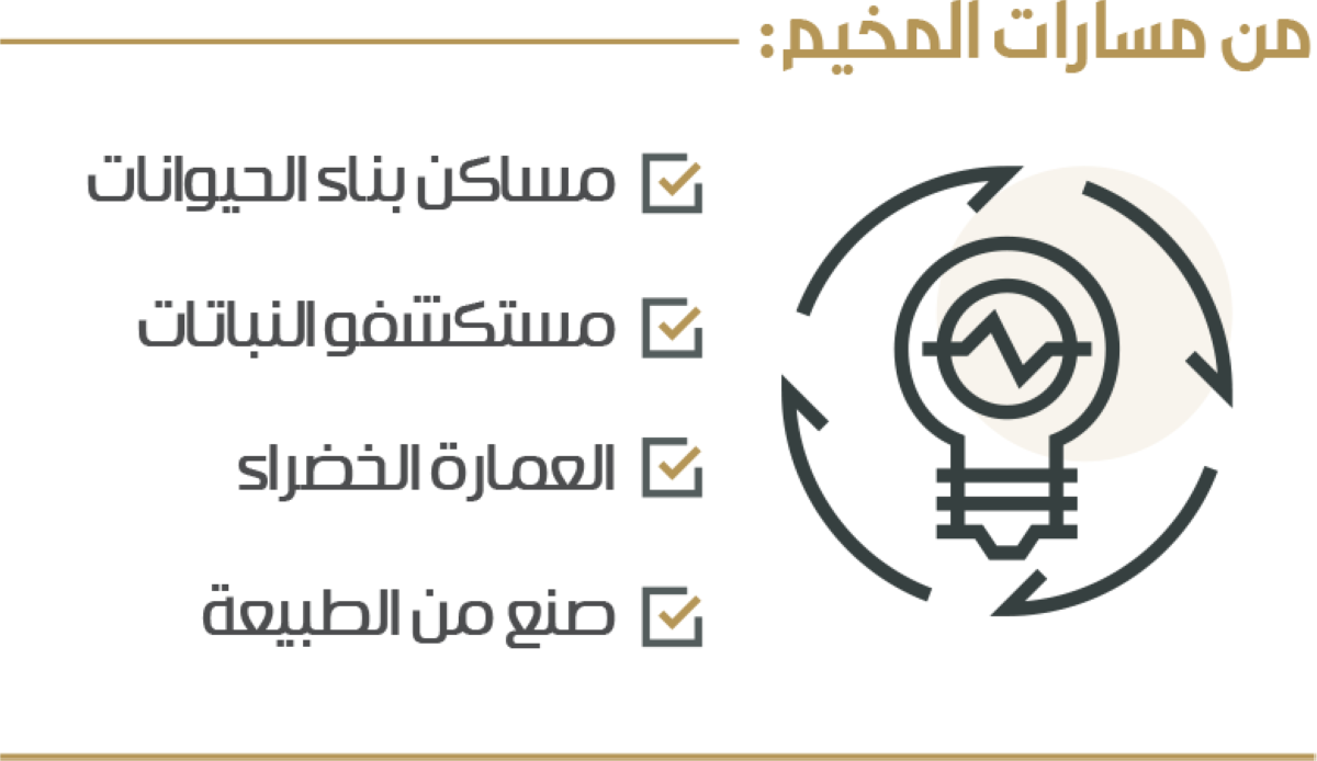 ويقدم المخيم ضمن مسار «مساكن الحيوانات» تجربة الأطفال الممتدة من الهندسة المعمارية الكامنة في بيوت الحيوانات إلى الخوض في أهمية العمارة الطبيعية، ويتخلل ذلك رواية القصص والاطلاع على جوانب الفن والتصميم، وزيارة متاحف ومرافق إثراء، والاطلاع على بناء مساكن الحيوانات والحشرات والطيور وحتى الأسماك، وما يتطلب من الهندسة والتصميم.