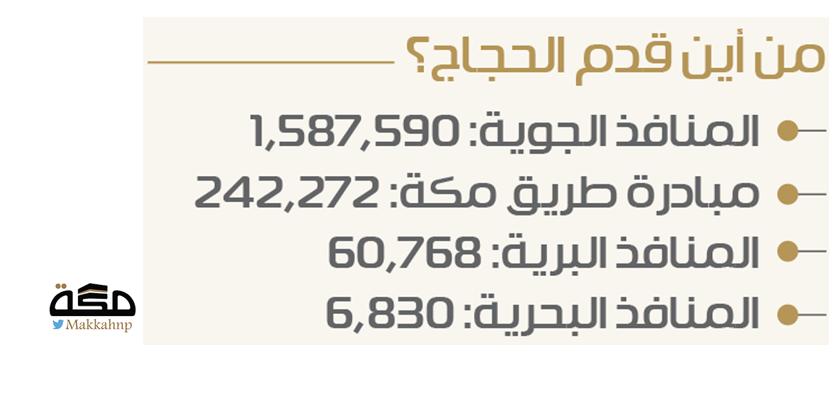 أعلنت المديرية العامة للجوازات قدوم 1,655,188 حاجا خلال موسم الحج لهذا العام عبر جميع منافذ المملكة الجوية والبرية والبحرية، وذلك حتى نهاية أمس الأول.