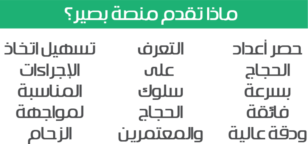 وتعد «بصير» أحدث مبادرات التقنية التي تدعم جهود الجهات الحكومية في الحج وإدارة الحشود، في إطار توجيهات القيادة لتوفير ظروف السكينة والطمأنينة والأمن والسلامة لحجاج بيت الله الحرام، ليتمكنوا من أداء حجهم ولتحقيق مستهدفات برنامج خدمة ضيوف الرحمن، أحد برامج رؤية السعودية 2030، الذي يسعى لإحداث نقلة نوعية في تجربة الحج.
