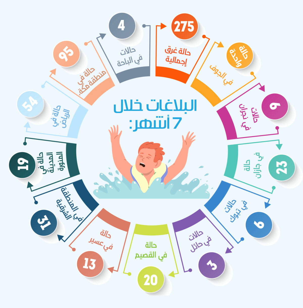 وسجل الهلال الأحمر خلال الـ7 أشهر الماضية بلاغات لغرق المسابح بواقع 275 في مناطق المملكة وشملت كلا من الرياض 54 حالة غرق، ومكة المكرمة 95 حالة، و19 حالة في المدينة المنورة.