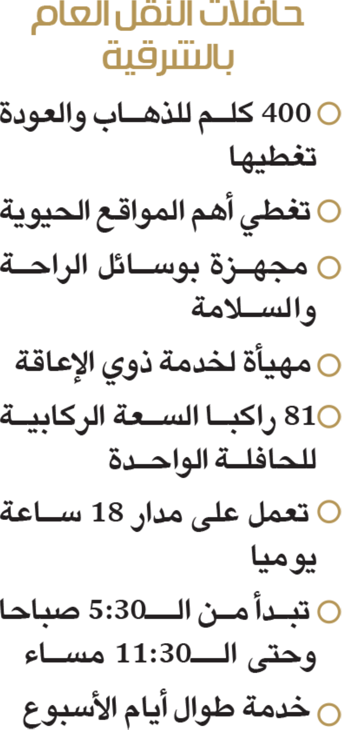 فيما يدعم جودة الحياة، أسهم مشروع النقل العام بالمنطقة الشرقية في إحداث نقلة نوعية في خيارات التنقل وتجويد الحياة، من خلال شبكة خطوط ومسارات ومحطات، تضم 212 محطة رئيسة ومتوسطة وفرعية، موزعة داخل مدينتي الدمام والظهران، ومحافظتي الخبر والقطيف، إلى جانب محطة رئيسة بمطار الملك فهد الدولي بالدمام، في حين تغطي 77 حافلة المحطات حسب المسارات المحددة.