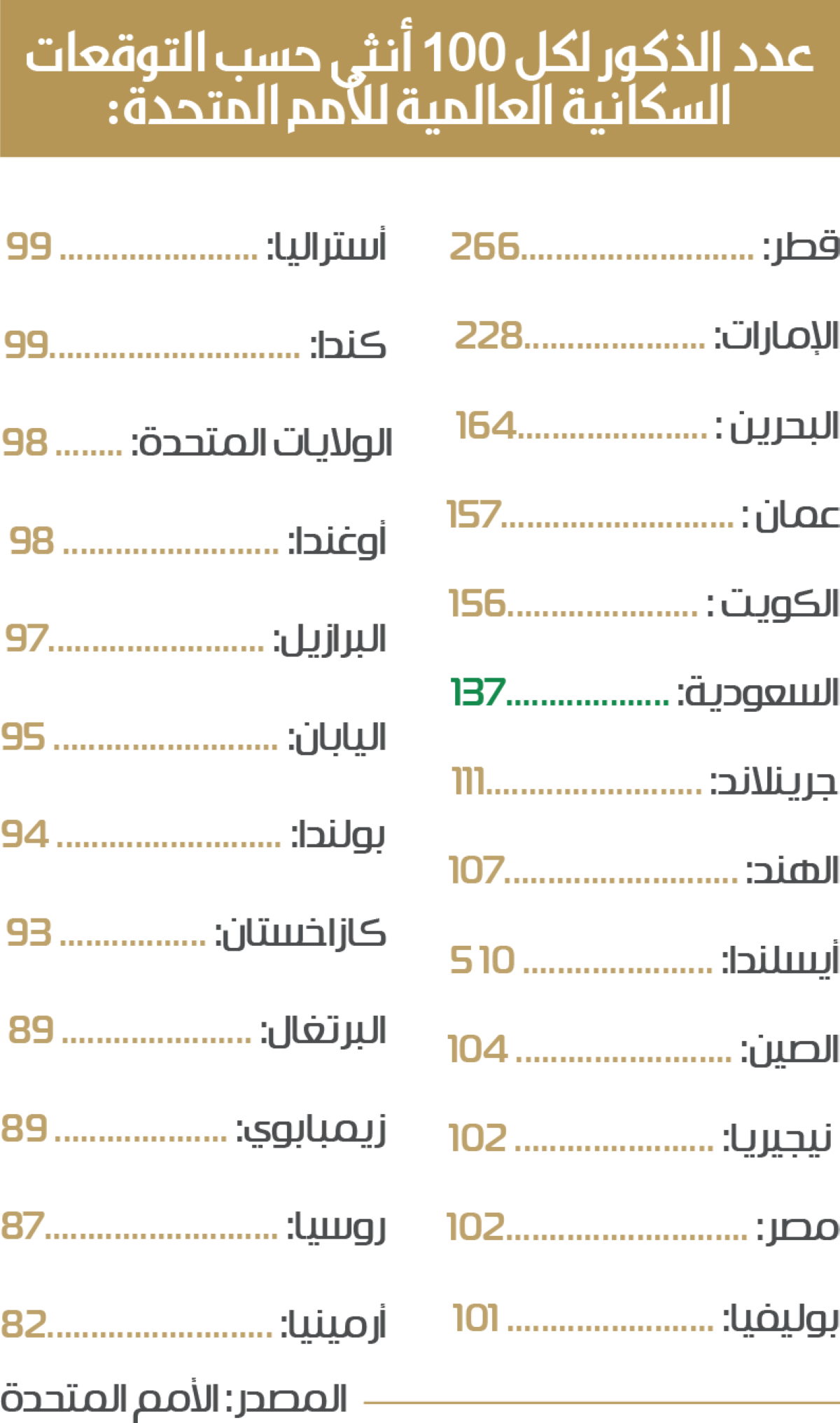 مما يجعل دول الخليج تتصدر القائمة عالميا من حيث عدد المواطنين الذكور.