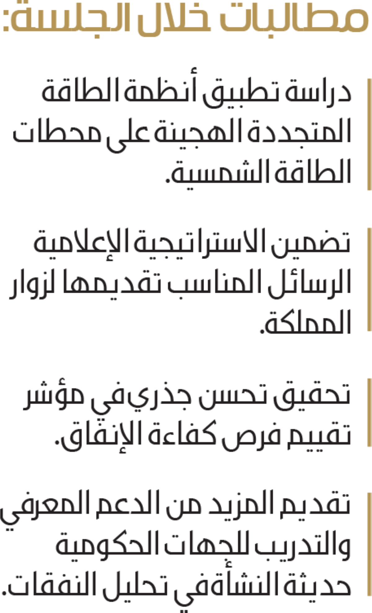 ودعا المجلس في قراره الوزارة إلى التوسع في تنمية صناعة ألواح الطاقة الشمسية ومكوناتها وتوطينها لرفع المحتوى المحلي من صناعة الطاقة المتجددة، مطالبا في ذات القرار بدعم الوزارة لتوفير الخدمات الأساسية والمرافق العامة للمدن الصناعية وتحديدا في المناطق الواعدة.