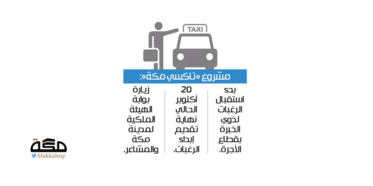 تعزيزا لتقديم أفضل خدمات النقل في مكة المكرمة ورفعا لمستوى المنافسة والشفافية لمقدمي الخدمات، أعلنت الهيئة الملكية لمدينة مكة المكرمة والمشاعر المقدسة، ممثلة بالمركز العام للنقل بمكة والمشاعر بالتعاون مع الهيئة العامة للنقل، عن مشروع التشغيل لمركبات الأجرة بمدينة مكة المكرمة «تاكسي مكة».