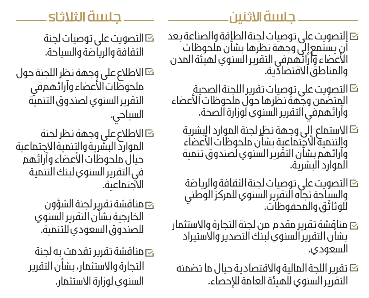- مناقشة تقرير لجنة الشؤون الخارجية بشأن التقرير السنوي للصندوق السعودي للتنمية.