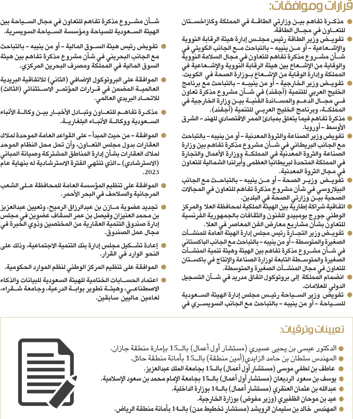 ووافق على إعادة تشكيل مجلس إدارة بنك التنمية الاجتماعية، وتنظيم المركز الوطني لنظم الموارد الحكومية.