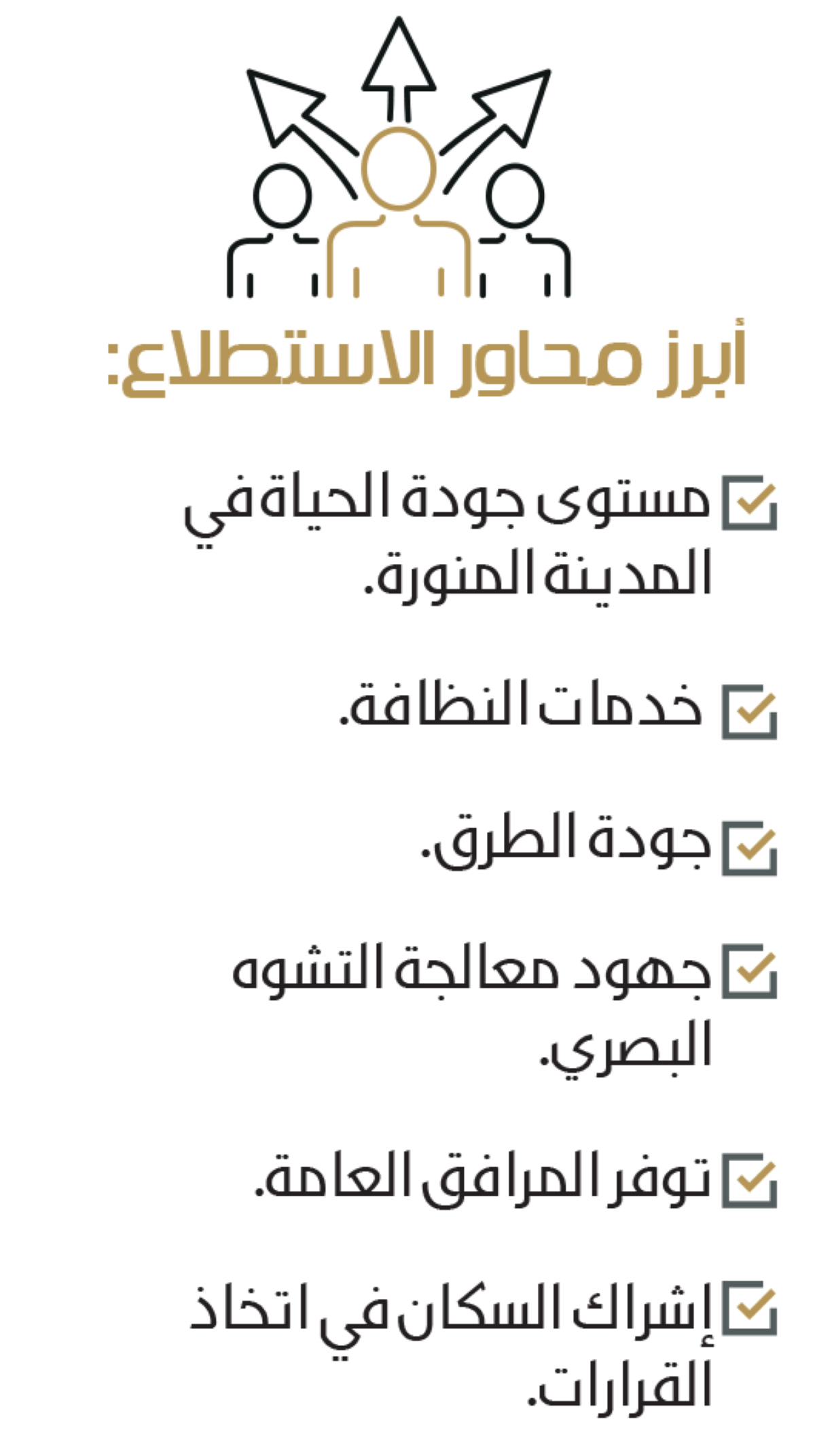 تجري أمانة منطقة المدينة المنورة استطلاعا لقياس رضا سكان المنطقة عن الخدمات البلدية المقدمة، ويشمل مستوى جودة الحياة في المدينة المنورة، وخدمات النظافة، وجودة الطرق، وجهود معالجة التشوه البصري، وتوفر المرافق العامة، وإشراك السكان في اتخاذ القرارات المتعلقة بتقديم الخدمات في مختلف الأحياء.