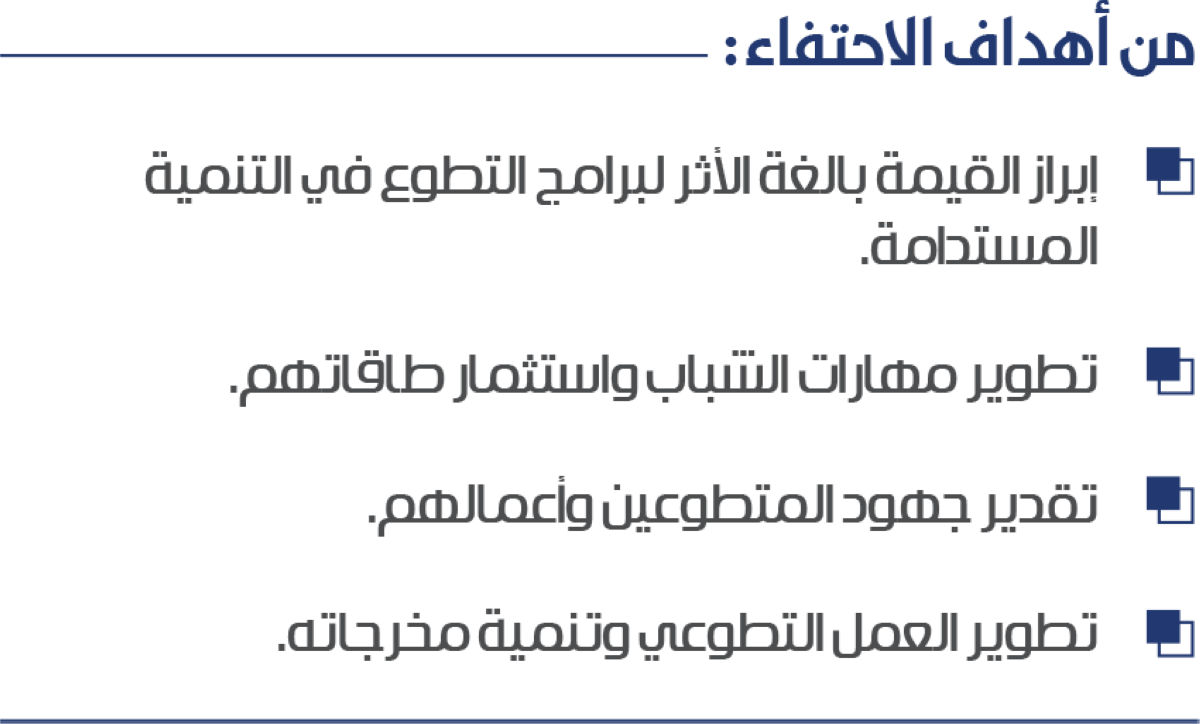 - إبراز القيمة بالغة الأثر لبرامج التطوع في التنمية المستدامة.