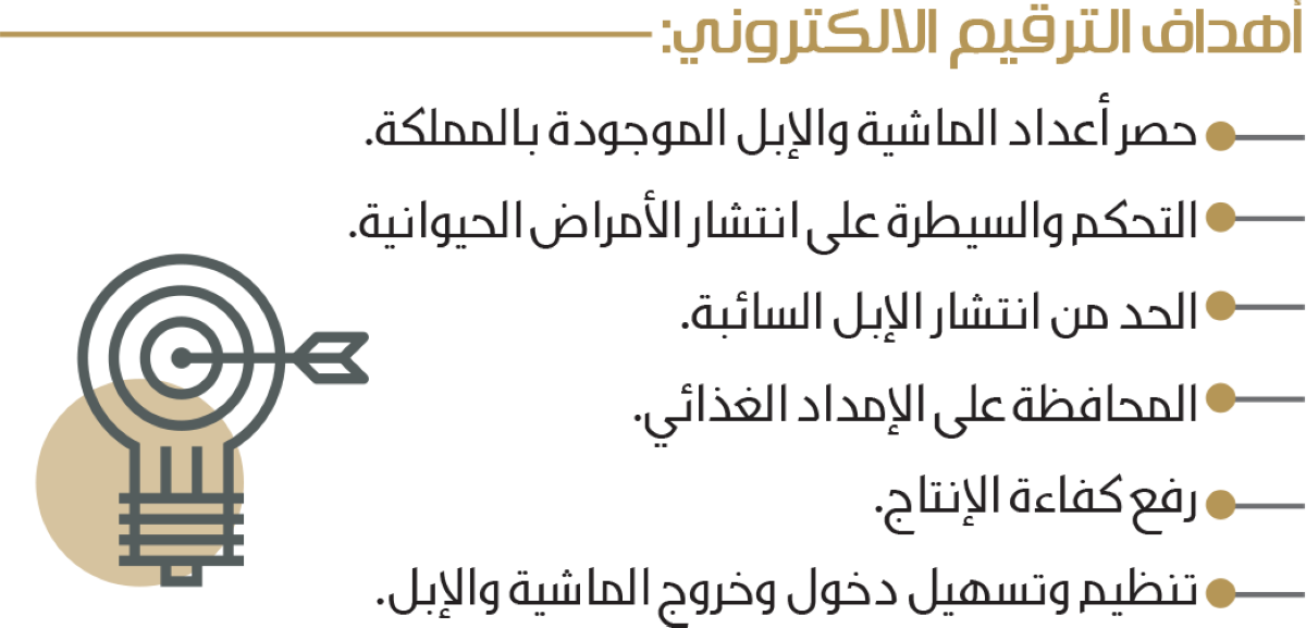 ويستهدف الترقيم الالكتروني للماشية والإبل حصر أعداد الماشية والإبل المتواجدة بالمملكة، بغية التحكم والسيطرة على انتشار الأمراض الحيوانية والمشتركة، والحد من انتشار الإبل السائبة، والمحافظة على الإمداد الغذائي، ورفع كفاءة الإنتاج، وتنظيم وتسهيل دخول وخروج الماشية والإبل عبر المنافذ الحدودية.