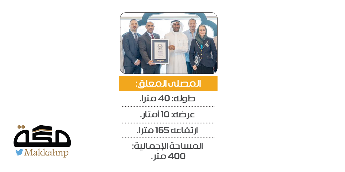 حقق المصلى المعلق الذي يقع بين البرجين التوأم في فندق جبل عمر «العنوان» بالعاصمة المقدسة، والمشيد من قبل شركة جبل عمر للتطوير، إنجازا باعتباره أعلى مصلى في العالم داخل جسر معلق بارتفاع يبلغ 165 م، وفقا لموسوعة جينيس للأرقام القياسية.