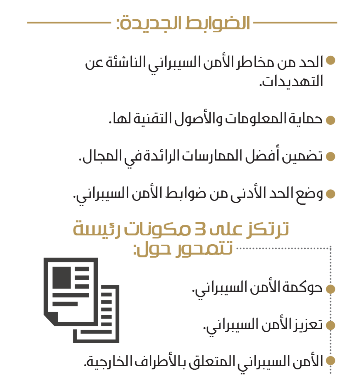 وأوضحت أن الوثيقة المطروحة لمرئيات العموم، تضع الحد الأدنى من ضوابط الأمن السيبراني لجهات القطاع الخاص من غير ذات البنى التحتية الحساسة، وترتكز على ثلاثة مكونات رئيسة تتمحور حول، حوكمة الأمن السيبراني، وتعزيز الأمن السيبراني، والأمن السيبراني المتعلق بالأطراف الخارجية، لافتة إلى أن هذه الضوابط تم وضعها وتطويرها من خلال إجراء دراسة شاملة لمجموعة من الإرشادات والضوابط الدولية المتعلقة بالأمن السيبراني، وتحليل ما تم رصده من مخاطر وتهديدات سيبرانية مرتبطة بها.