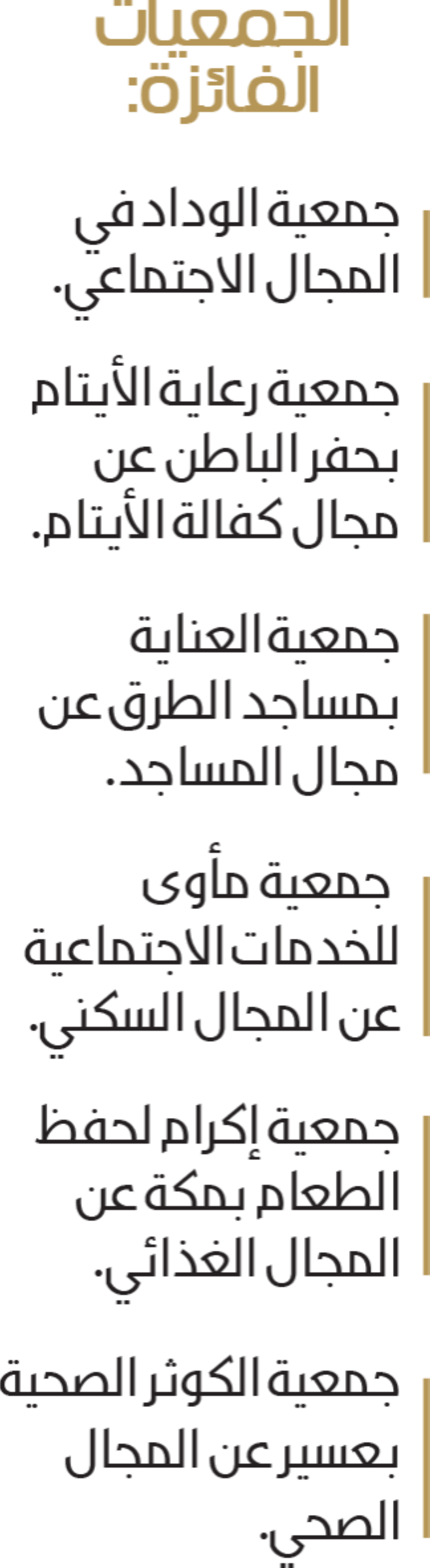 وتندرج الجائزة ضمن 6 مجالاتٍ مختلفة، حيث فازت جمعية الوداد في المجال الاجتماعي، وجمعية رعاية الأيتام بمحافظة حفر الباطن (تراؤف) عن مجال كفالة الأيتام، أما الجمعية الفائزة عن مجال المساجد هي جمعية العناية بمساجد الطرق، وفازت من المجال السكني جمعية مأوى للخدمات الاجتماعية، وعن المجال الغذائي جمعية إكرام لحفظ الطعام بمكة، وفي المجال الصحي كانت جمعية الكوثر الصحية بعسير.