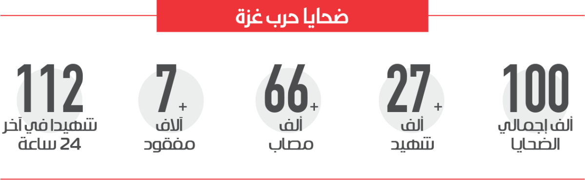 فيما أكدت منظمة الأمم المتحدة للطفولة «يونيسف» أن نحو 17 ألف طفل فلسطيني يعيشون في قطاع غزة دون أبويهم أو أشقائهم بسبب العدوان الإسرائيلي، قالت منظمة الصحة العالمية إن أكثر من 100 ألف من سكان القطاع أصيبوا أو فقدوا أو قتلوا، مع تدهور الوضع في القطاع، وهو ما يشكل 4,3% من إجمالي السكان البالغ عددهم 2.3 مليون نسمة.