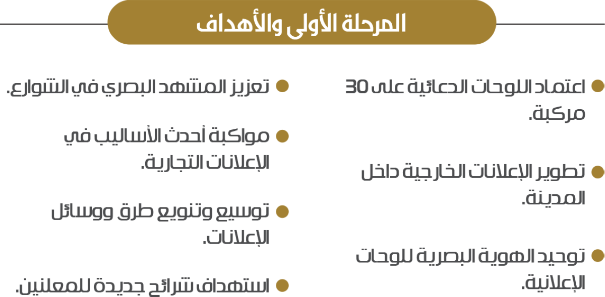 ويأتي المشروع بمرحلته الأولى الذي يتضمن اعتماد اللوحات الدعائية على 30 مركبة، تماشيا مع استراتيجية تطوير الإعلانات الخارجية داخل المدينة المنورة، وتوحيد الهوية البصرية للوحات الإعلانية بما ينسجم مع توجهات تعزيز المشهد البصري المتوافق مع استراتيجية المنطقة، خاصة في الشوارع الرئيسة والطرقات التي تسلكها المركبات والحافلات المستهدفة، إلى جانب مواكبة أحدث الأساليب في الإعلانات التجارية، خلال اتباع أفضل الممارسات المتخصصة في هذا الجانب، وتوسيع وتنويع طرق ووسائل الإعلانات، وهو ما يسهم في استهداف شرائح جديدة للمعلنين، وتحقيق نتائج إيجابية في الحملات الدعائية والتجارية على مستوى المدينة المنورة.