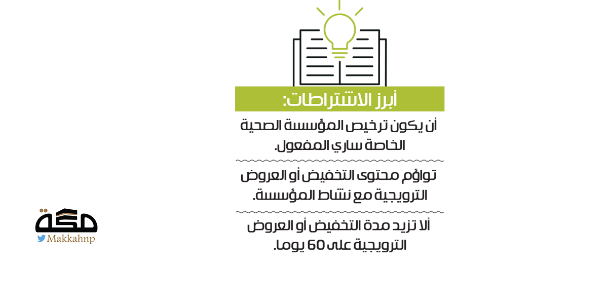 تمنح الموافقات على إجراء التخفيضات والعروض الترويجية من إدارات التراخيص الصحية في الشؤون الصحية بالمناطق والمحافظات وفق 7 اشتراطات، تبدأ بالتقدم بطلب إجراء تخفيض أو عروض ترويجية لإدارة التراخيص الصحية مع تحديد الخدمات الصحية المراد تخفيضها، متضمنا التسعيرة المعتمدة ونسبة التخفيض، وذلك بحسب المادة السابعة من نظام المؤسسات الصحية الخاصة.