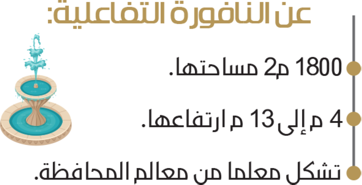 وبينت بلدية المحافظة أن المشروع يأتي ضمن مبادرة «أنسنة المدن وتحسين جودة الحياة»، التي تعد إحدى مستهدفات رؤية المملكة 2030م، لافتة إلى أن النافورة تأتي ضمن مشروع متنزه الشهداء العام بالمحافظة، كما يضم المتنزه عددا من وسائل الترفيه الحديثة والملاعب وجزيرة مائية وجلسات للزوار، وعددا 26 من الحاضنات البلدية لدعم الأسر المنتجة، وغيرها من المرافق، كما يستوعب طاقة استيعابية لعدد كبير من الزوار.