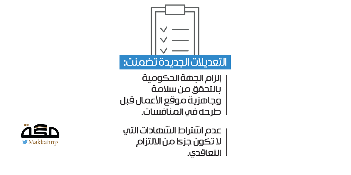 - إلزام الجهة الحكومية بالتحقق من سلامة وجاهزية موقع الأعمال قبل طرحه في المنافسات.