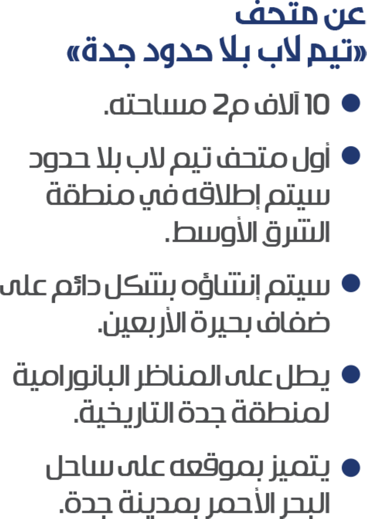 ويعد «تيم لاب بلا حدود» عالما من الأعمال الفنية بلا حدود، ومتحفا بلا خريطة تم إنشاؤه من قبل المجموعة الفنية العالمية «تيم لاب»، في حين يستعد فريق تيم لاب للافتتاح من خلال العمل على العديد من الأعمال الفنية الكبيرة، بمساحة إبداعية رياضية ضخمة، وهي «غابة الألعاب الرياضية»، إلى جانب المشروع التعليمي للإنشاء التعاوني، وهو «مدينة ألعاب المستقبل»، كما أعلن المتحف عن توفر التذاكر حاليا على الموقع الرسمي: https://www.teamlab.art/ar/e/jeddah .