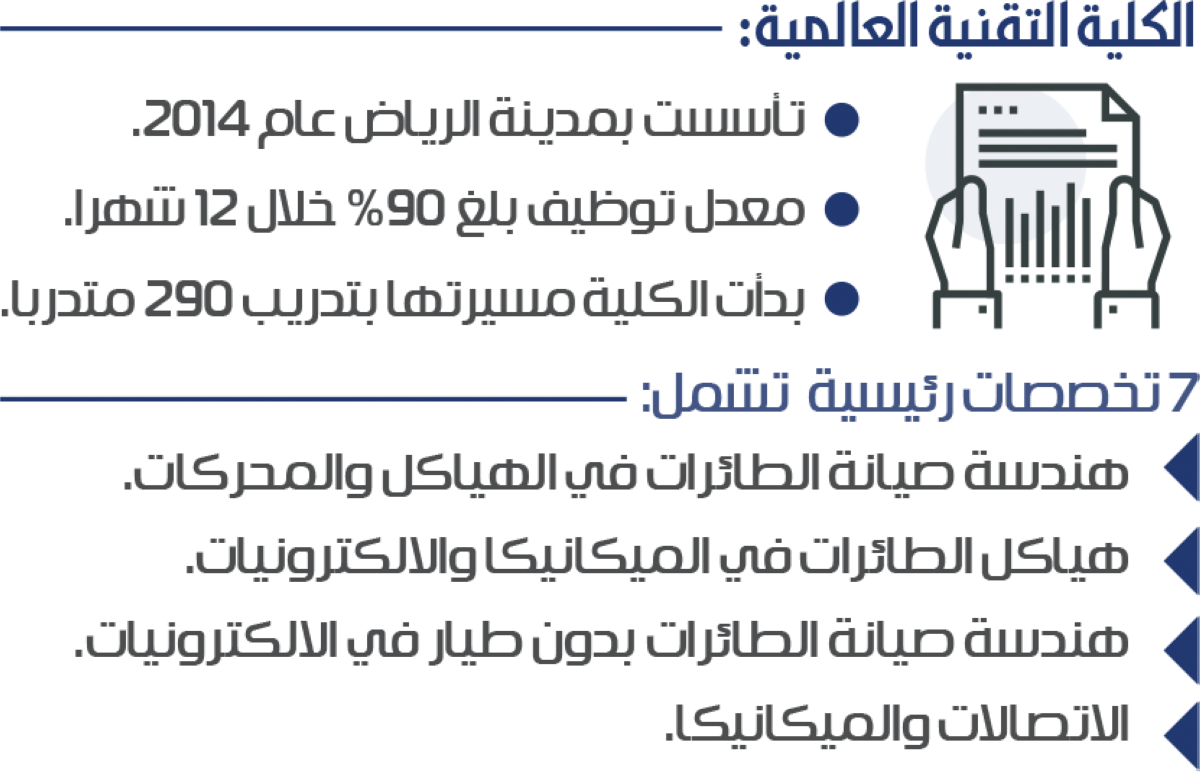 فيما ارتفع معدل توظيف السعوديين في هندسة الطائرات لـ85 %، شهدت الكلية التقنية العالمية لعلوم الطيران حفل تخريج 1354 شابا في تخصص هندسة صيانة الطائرات برعاية وزير التعليم يوسف البنيان، وحضور عدد من القيادات في قطاع الطيران والتعليم.
