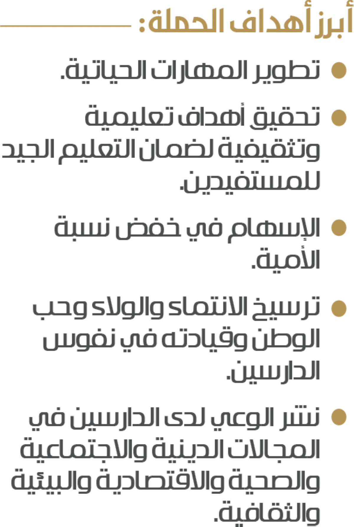 وأضاف أن الحملة هي أحد البرامج التعليمية التي تستهدف فئة من المواطنين والمواطنات في أماكنهم ، وتعليم الدارسين والدارسات المهارات الأساسية ونشر الوعي الديني والثقافي والاجتماعي والصحي لديهم، وتعزيز الحس والانتماء الوطني.