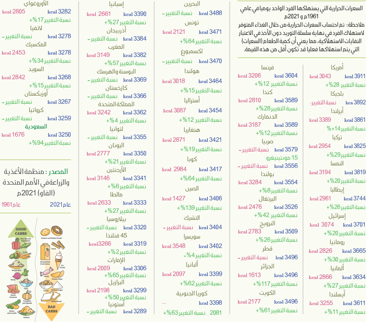 أما الدول التي انخفض استهلاك الفرد فيها من السعرات الحرارية في 2021م مقارنة بالعام 1961م فتصدرتها الأردن بـ 47%- ثم أفغانستان بـ27%-.