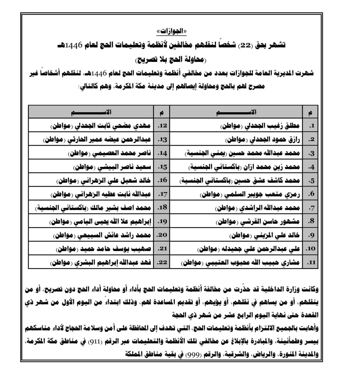 شهرت المديرية العامة للجوازات بعدد من مخالفي أنظمة وتعليمات الحج لعام 1446هـ، لنقلهم أشخاصًا غير مصرح لهم بالحج ومحاولة إيصالهم إلى مدينة مكة المكرمة، وهم كالتالي: