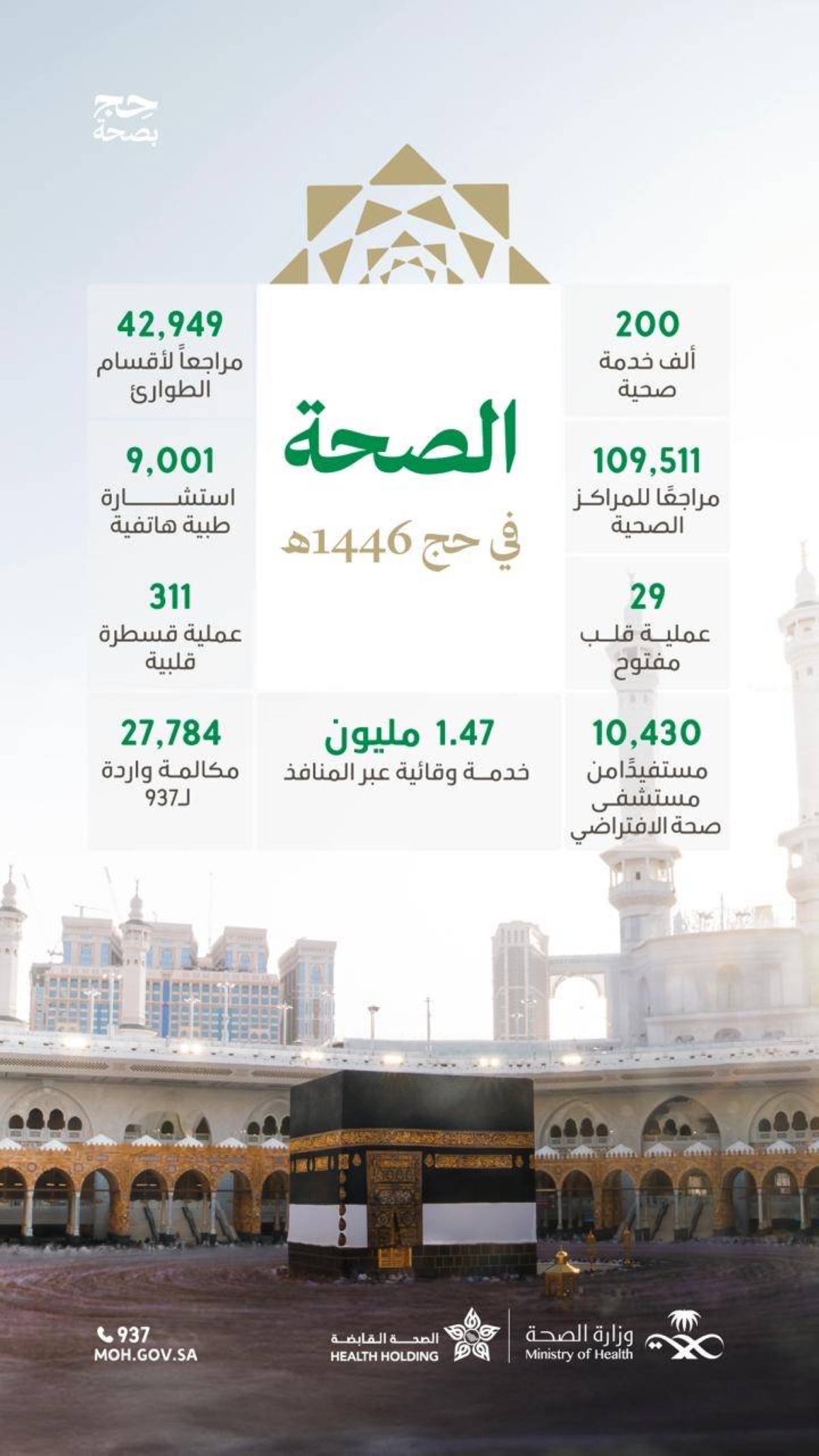 وبلغ إجمالي عدد المراجعين للمراكز الصحية خلال موسم الحج أكثر من (109,511) مراجعًا، وإجراء (29) عملية قلب مفتوح، و(311) عملية قسطرة قلبية، واستقبلت أقسام الطوارئ (42,949) حالة، ووصل عدد مستفيدي مستشفى صحة الافتراضي (10,430) حاجًا، إلى جانب تقديم (9,001) استشارة طبية هاتفية، واستقبل مركز الاتصال الموحد (937) أكثر من (27,784) مكالمة واردة، ونُفّذت (1.47) مليون خدمة وقائية عبر المنافذ حول المملكة.