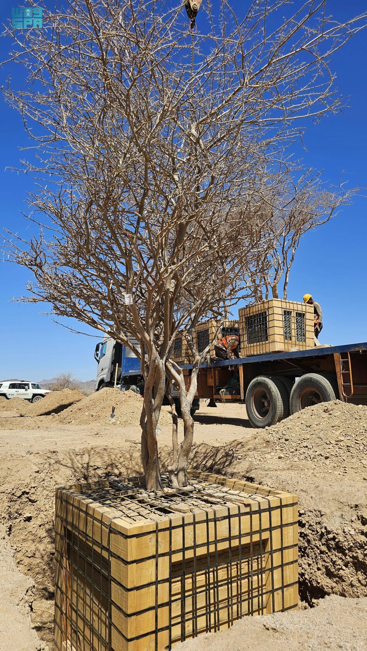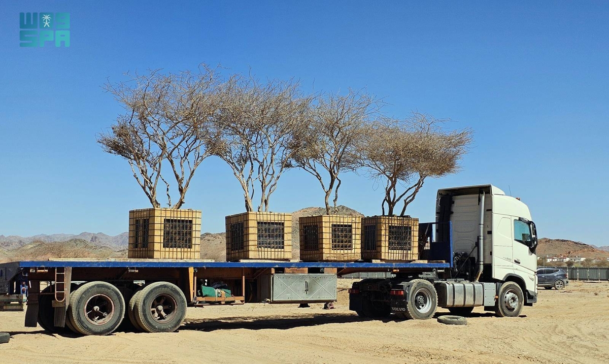 نقل فريق مختص من المركز الوطني لتنمية الغطاء النباتي ومكافحة التصحر بمنطقة المدينة المنورة، 5 أشجار معمرة في قرية الفريش 60 كلم غرب المدينة المنورة، إلى أراضي الغطاء النباتي بالمنطقة، توفر لها بيئة ملائمة للنمو.