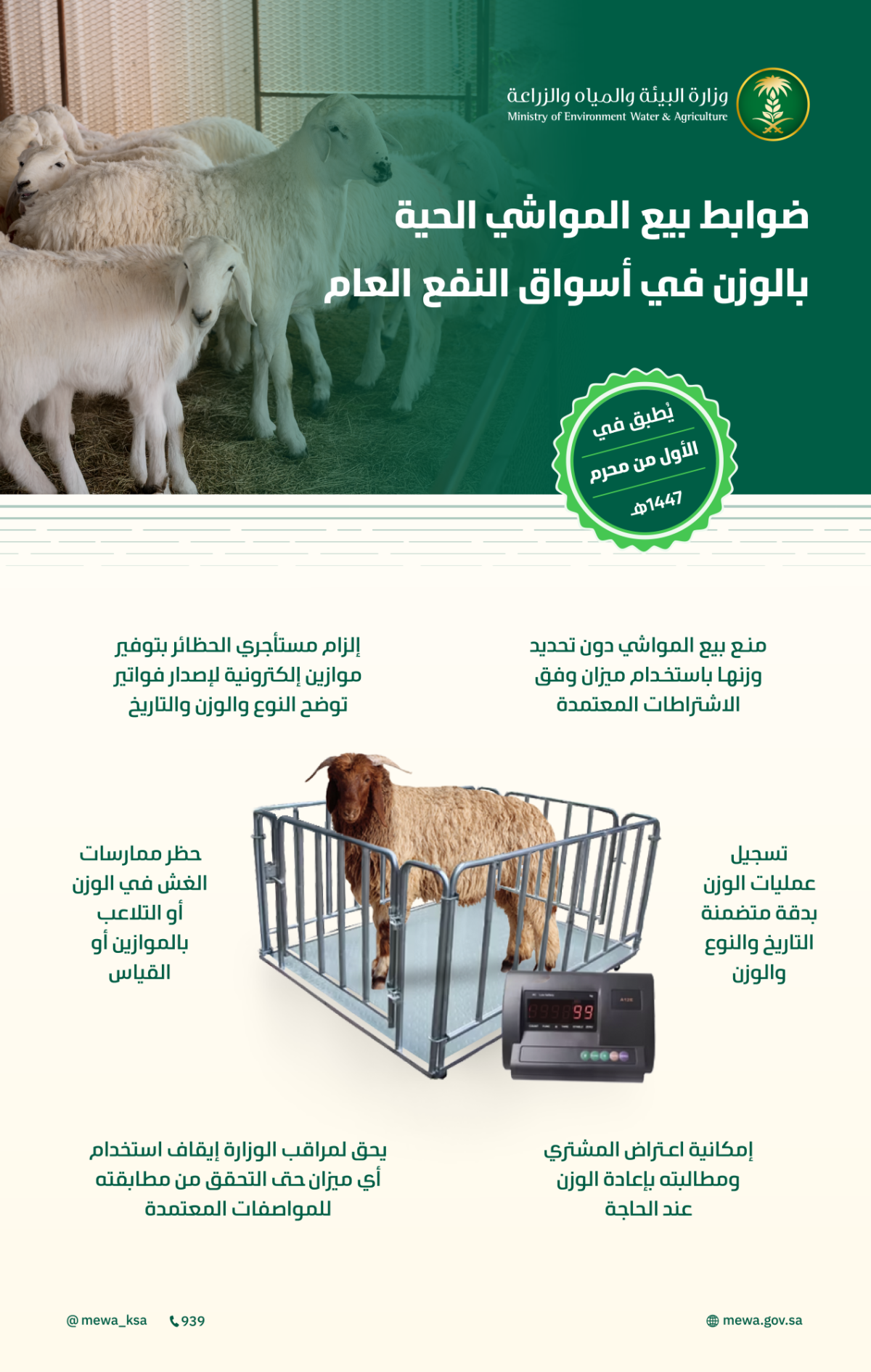 وحددت الوزارة عددًا من الضوابط لبيع المواشي بالوزن؛ بهدف ضمان تطبيق المعايير التي تكفل تداولها وبيعها للمستهلكين، وتحقيق أقصى فائدة مرجوة من هذا الإجراء؛ بما ينعكس بشكل إيجابي على قطاع الثروة الحيوانية في المملكة، إضافةً إلى تعزيز قيم العدالة والشفافية في بيع وشراء المواشي، وتحسين جودة واستدامة الخدمات المقدمة في أسواق النفع العام.