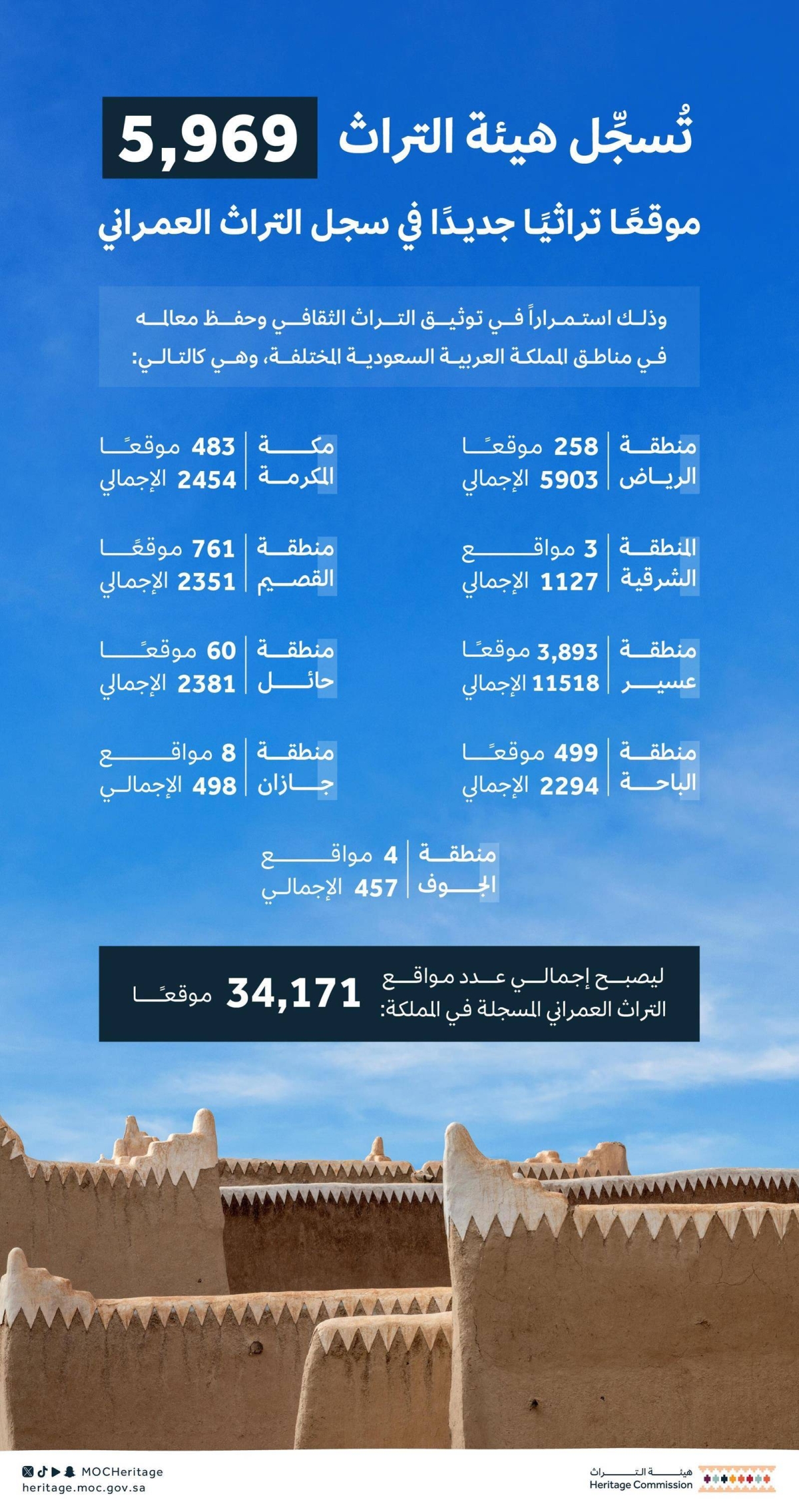 أعلنت هيئة التراث عن تسجيل 5969 موقعا تراثيا عمرانيا جديدا بالسجل الوطني للتراث العمراني، ليرتفع بذلك إجمالي عدد المواقع المسجلة إلى 34,171 موقعا تعكس في مجملها ثراء وتنوع التراث المعماري في مناطق المملكة المختلفة.
