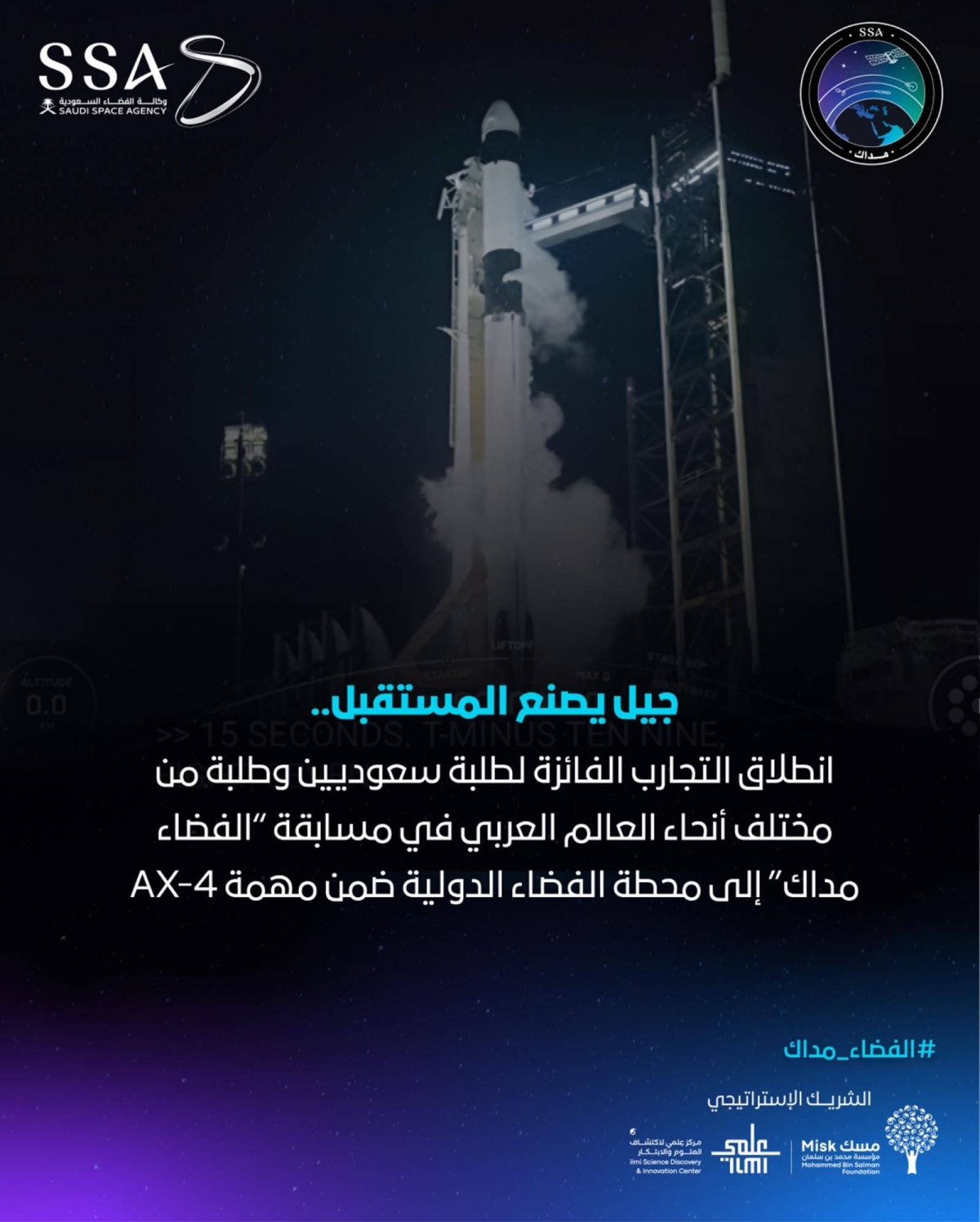 أعلنت وكالة الفضاء السعودية إطلاق التجارب الفائزة في مسابقة «الفضاء مداك» إلى محطة الفضاء الدولية، ضمن مهمة فضائية دولية انطلقت صباح أمس من مركز كينيدي للفضاء في ولاية فلوريدا بالولايات المتحدة الأمريكية، في خطوة تجسد التزام المملكة بتعزيز الابتكار العلمي وتمكين الكفاءات الواعدة في مجالات علوم الفضاء.