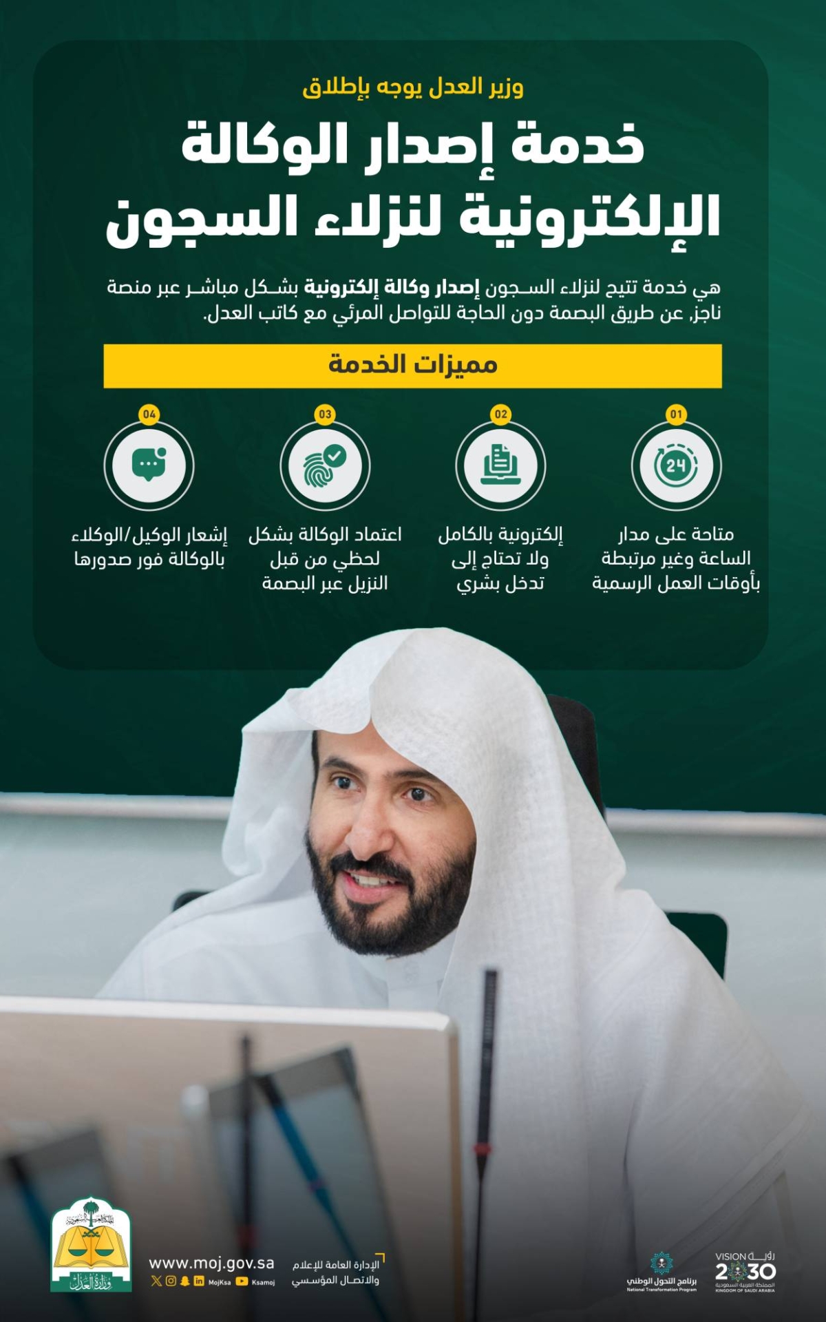 وجه وزير العدل الدكتور وليد بن محمد الصمعاني، بإطلاق خدمة إصدار الوكالة الإلكترونية لنزلاء السجون عبر منصة ناجز.