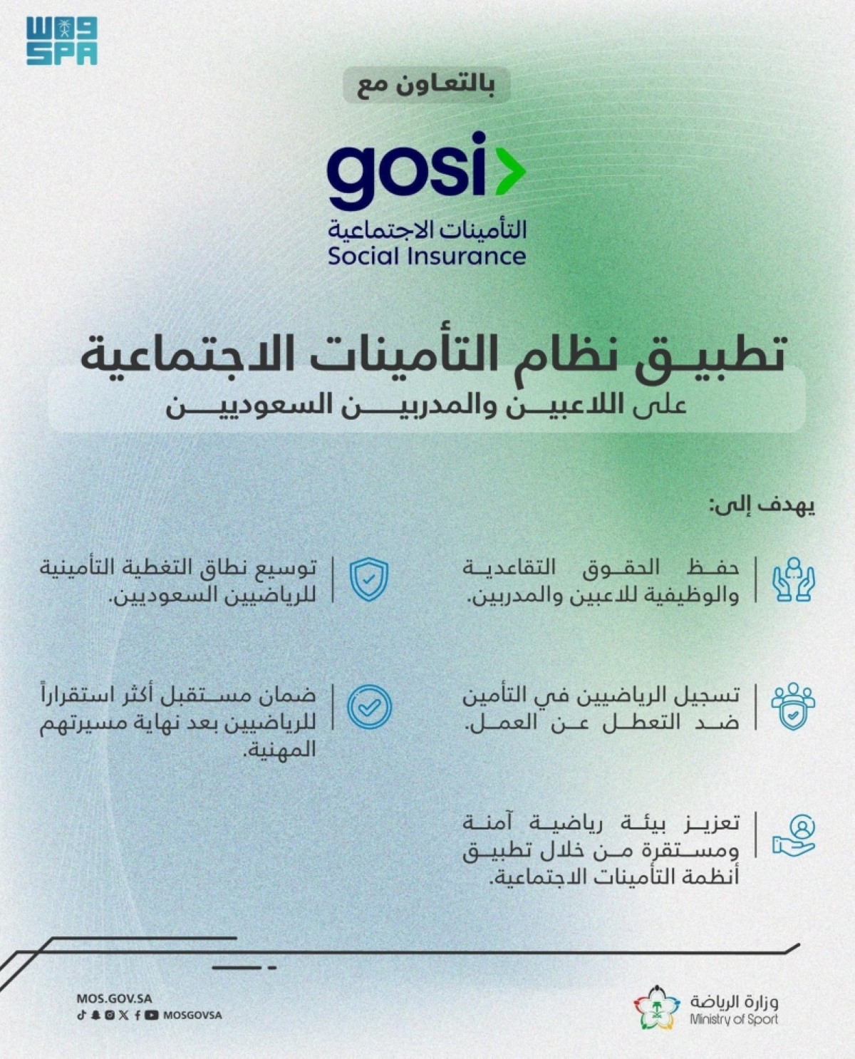 أعلنت وزارة الرياضة والمؤسسة العامة للتأمينات الاجتماعية عن البدء بتطبيق نظام التأمينات الاجتماعية على اللاعبين والمدربين السعوديين اعتبارا من الثلاثاء الموافق 1 يوليو 2025م.