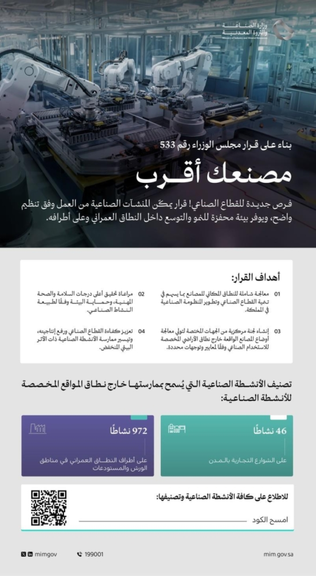 (4 / 7 / 1445هـ)، التي رأستها الوزارة بمشاركة 7 جهات حكومية أخرى؛ لمعالجة وضع المصانع الواقعة خارج نطاق الأراضي المخصصة للأنشطة الصناعية؛ بهدف تنظيم ممارسة الأنشطة الصناعية، وتحفيز الاستثمار الصناعي، وتعزيز التنمية الصناعية المستدامة بالمملكة.