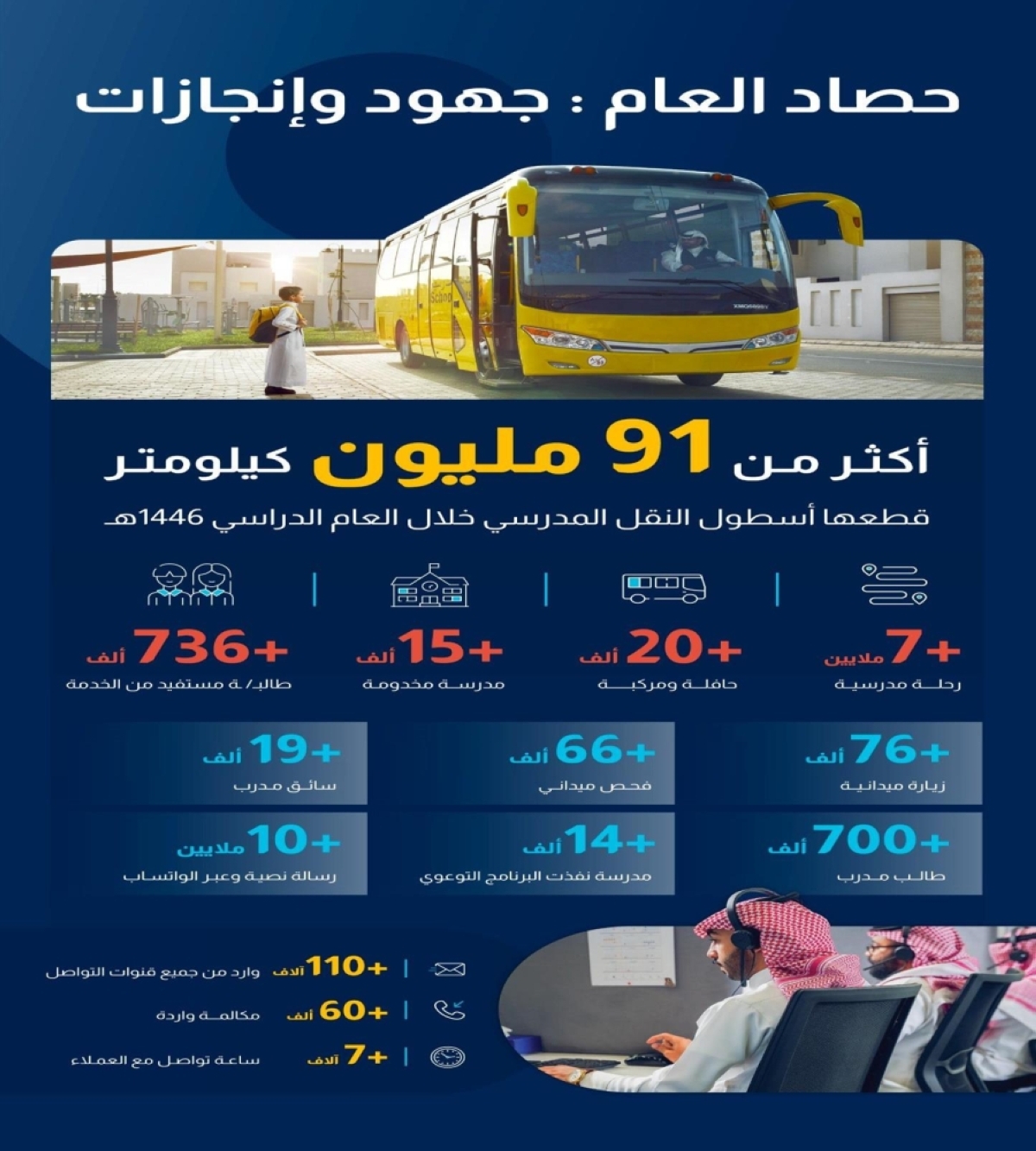 وقطع الأسطول خلال هذه الرحلات مسافة تجاوزت 91 مليون كلم عبر أكثر من 20 ألف حافلة ومركبة، لتقديم خدمة النقل المدرسي لأكثر من 736 ألف طالب وطالبة يدرسون في أكثر من 15 ألف مدرسة بمختلف مناطق المملكة، سواء لطلبة التعليم العام أو ذوي الإعاقة.