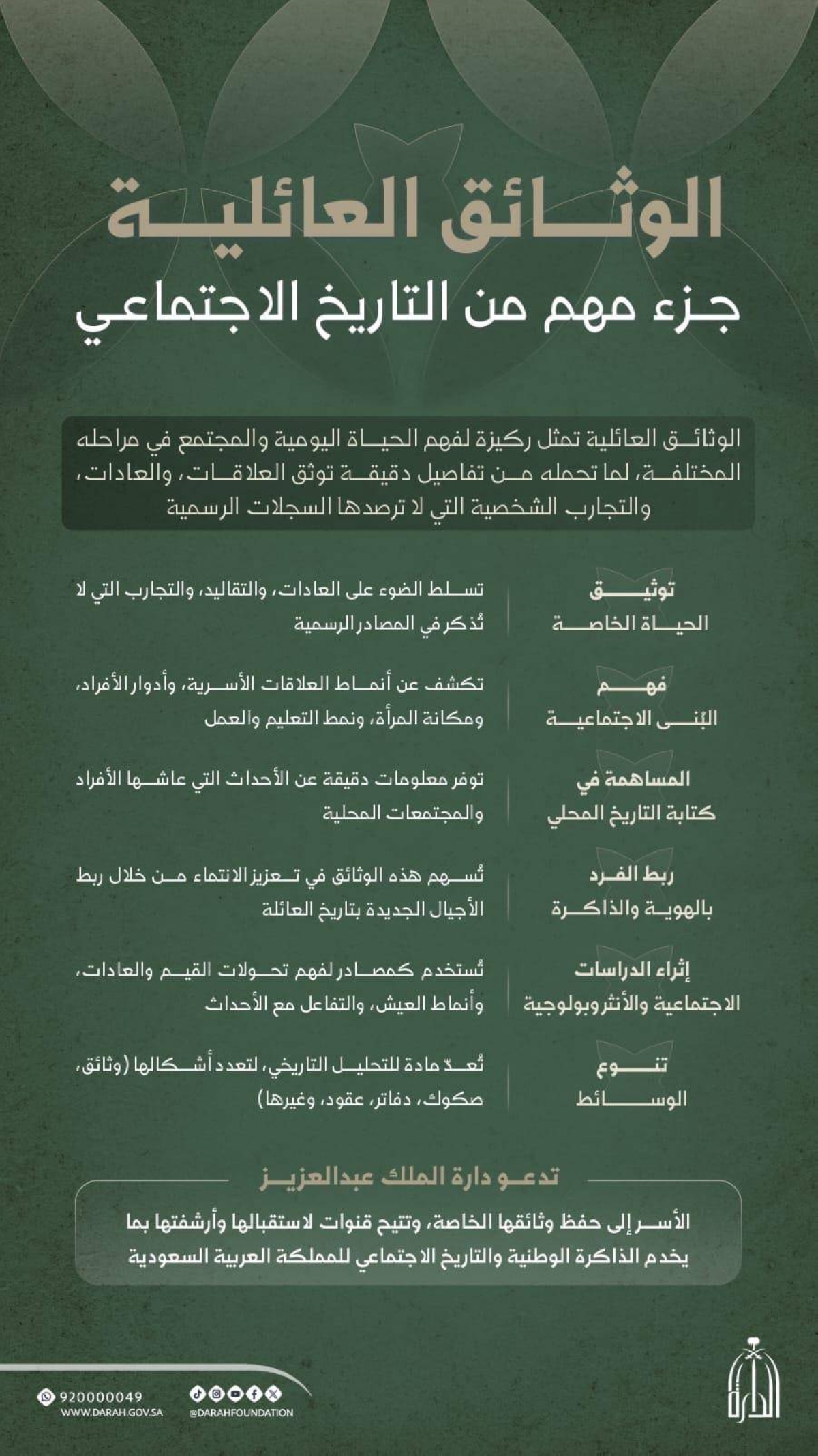 وأوضحت الدارة أن الوثائق العائلية تبرز أنماط العلاقات الأسرية، وأدوار الأفراد، ومكانة المرأة، ومسارات التعليم والعمل، إلى جانب دورها في تسليط الضوء على التحولات الاجتماعية والثقافية، من خلال ما تعكسه من عادات وتقاليد محلية.