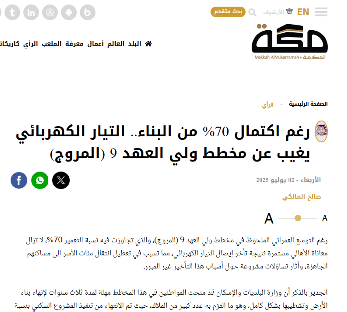 تثمن الشركة السعودية للكهرباء الجهود التي تقوم بها صحيفة مكة المتميزة في تسليط الضوء على الموضوعات التي تمس احتياجات المجتمع، ونشير إلى المقال المنشور بتاريخ 2 يوليو 2025م، تحت عنوان: "رغم اكتمال 70% من البناء.. التيار الكهربائي يغيب عن مخطط ولي العهد 9 (المروج)"، والذي تناول في الكاتب صالح المالكي معاناة الأهالي من تأخّر إيصال الخدمة الكهربائية للمخطط.